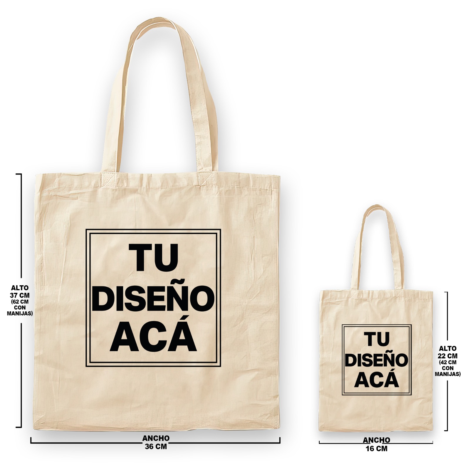 - Tote Bag Chica: 16 cm (ancho) x 22 cm (alto) – 42 cm con manijas.