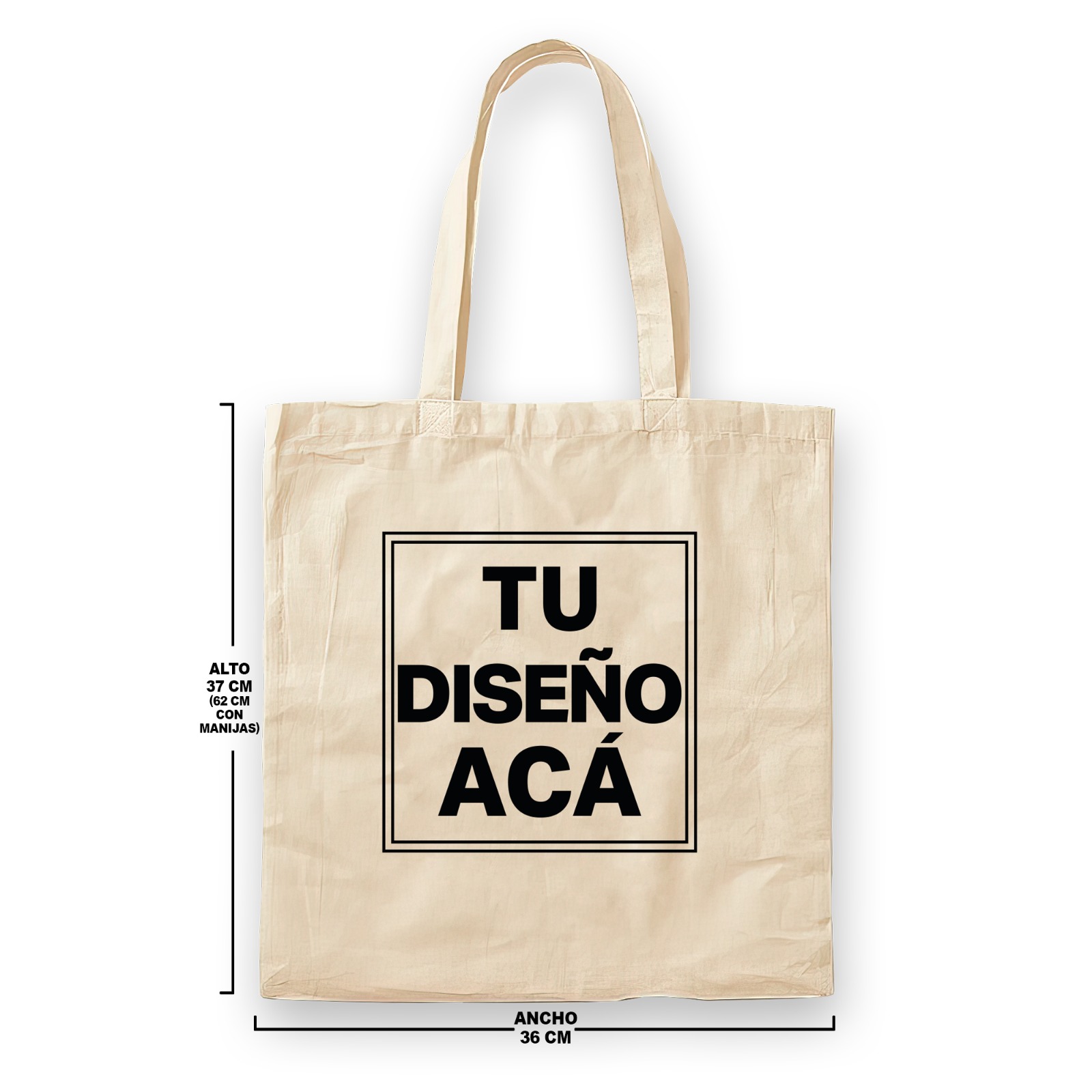 - Tote Bag Grande: 36 cm (ancho) x 37 cm (alto) – 62 cm con manijas.